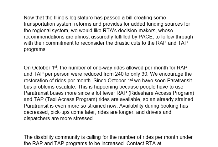 Now that the Illinois legislature has passed a bill creating some transportation system reforms and provides for added funding sources for the regional system, we would like RTA’s decision-makers, whose recommendations are almost assuredly fulfilled by PACE, to follow through with their commitment to reconsider the drastic cuts to the RAP and TAP programs.