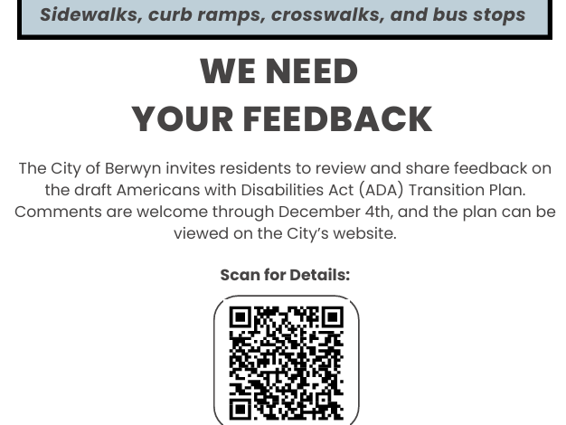 The City of Berwyn invites residents to review and share feedback on the draft Americans with Disabilities Act (ADA) Transition Plan. Comments are welcome through December 4th, and the plan can be viewed on the City’s website.