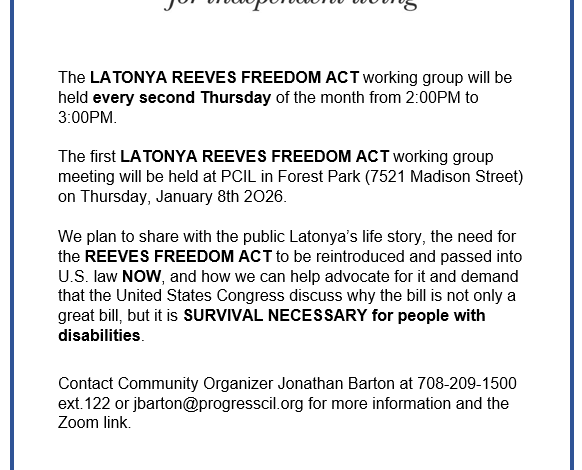 The first LATONYA REEVES FREEDOM ACT working group meeting will be held at PCIL in Forest Park (7521 Madison Street) on Thursday, January 8th 2O26.