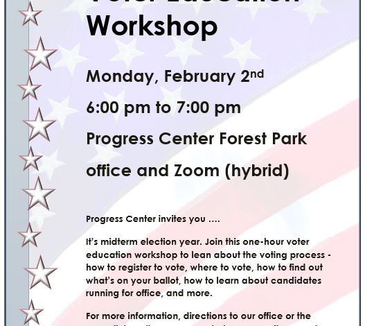 For more information, directions to our office or the Zoom link, call Progress Center’s Community Organizer Clark Craig at 708-209-1500 or email info@progresscil.org.