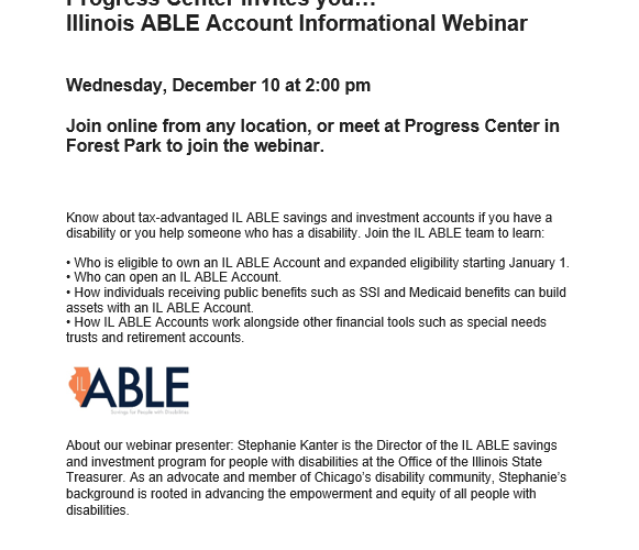 Progress Center invites you… Illinois ABLE Account Informational Webinar Wednesday, December 10 at 2:00 pm…