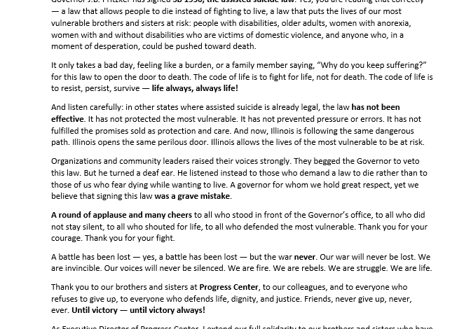 Today is a devastating day for the disability community and other vulnerable groups here in Illinois. Governor J.B. Pritzker has signed SB 1950, the assisted suicide law. Yes, you are reading that correctly — a law that allows people to die instead of fighting to live, a law that puts the lives of our most vulnerable brothers and sisters at risk: people with disabilities, older adults, women with anorexia, women with and without disabilities who are victims of domestic violence, and anyone who, in a moment of desperation, could be pushed toward death.