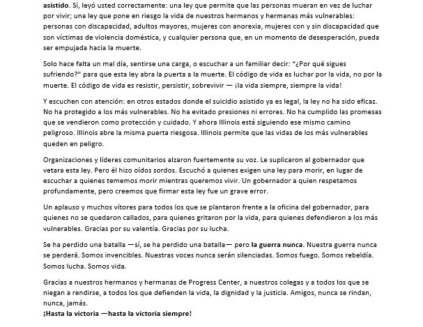 Hoy es un día devastador para la comunidad de personas con discapacidad y para otros grupos vulnerables aquí en Illinois. El gobernador J.B. Pritzker ha firmado la ley SB 1950, la ley de suicidio asistido. Sí, leyó usted correctamente: una ley que permite que las personas mueran en vez de luchar por vivir; una ley que pone en riesgo la vida de nuestros hermanos y hermanas más vulnerables: personas con discapacidad, adultos mayores, mujeres con anorexia, mujeres con y sin discapacidad que son víctimas de violencia doméstica, y cualquier persona que, en un momento de desesperación, pueda ser empujada hacia la muerte.
