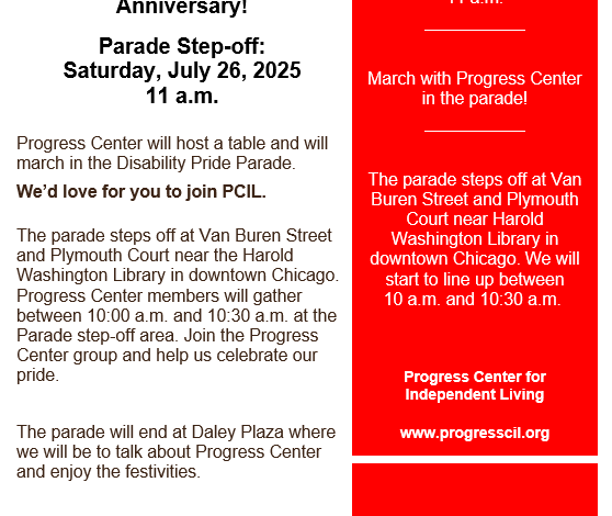 The Disability Committee will meet on Tuesday, September 16 at 2:00pm at Progress Center’s Blue Island office at 12940 S. Western Avenue. It is in the Moraine Valley Community College at Blue Island building, 3rd Floor. We look forward to seeing you there.