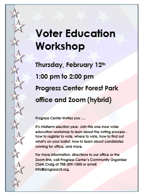 Progress Center invites you …. It’s midterm election year. Join this one-hour voter education workshop to lean about the voting process - how to register to vote, where to vote, how to find out what’s on your ballot, how to learn about candidates running for office, and more. Monday, February 2nd 6:00 pm to 7:00…